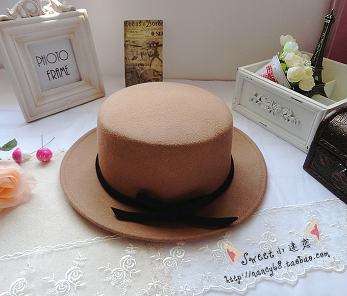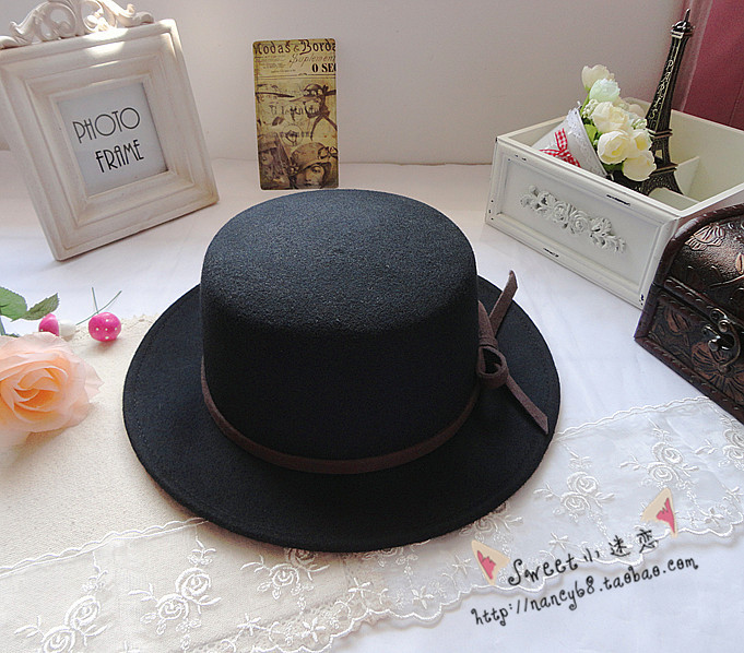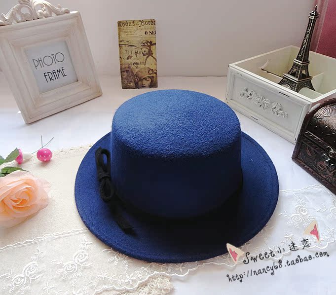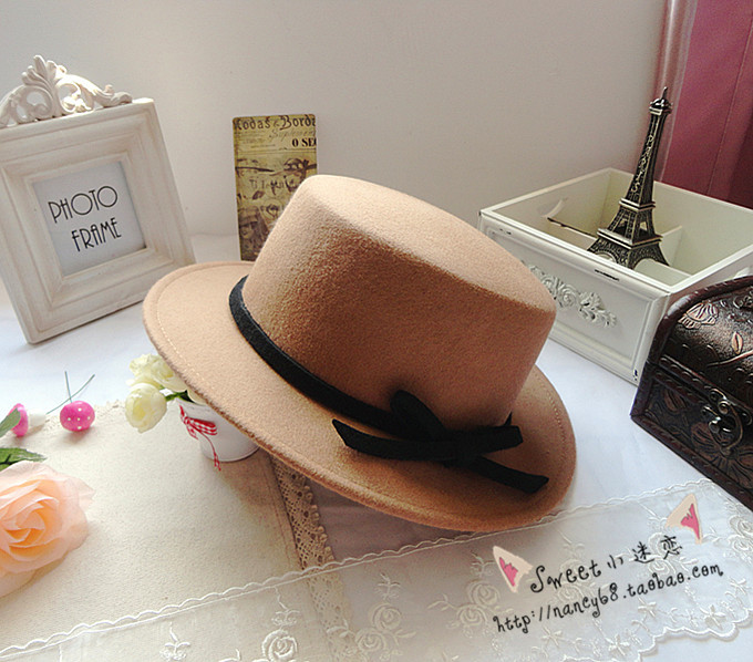 8881 秋冬新款英倫復古風蝴蝶結純羊毛呢平頂禮帽 高檔大檐帽子