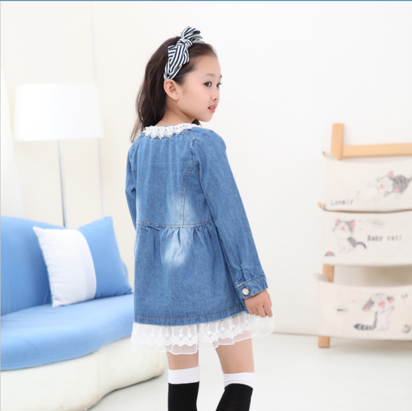 2015春款韓版中小女童牛仔裙長袖蕾絲牛仔紗裙代理加盟一件代發(fā)