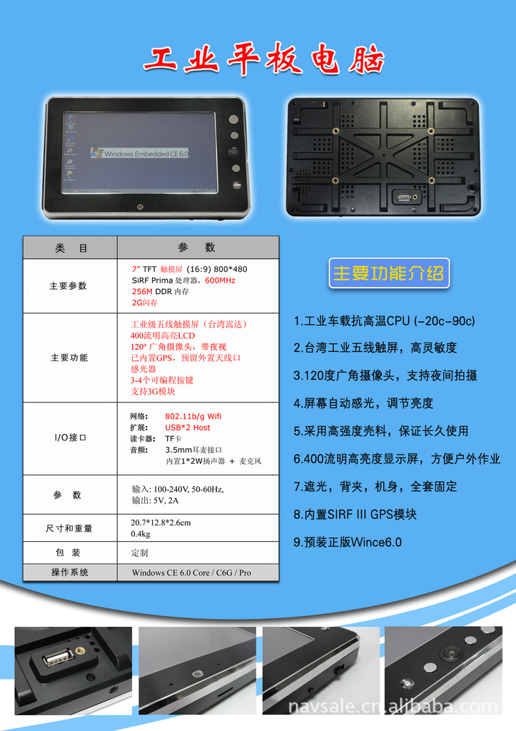 平板電腦批發(fā),抗高底溫,七寸五線觸摸屏Windows CE操作系統(tǒng)機(jī)器帶有串口160度感光攝像頭背部可固定具有三防功能。
