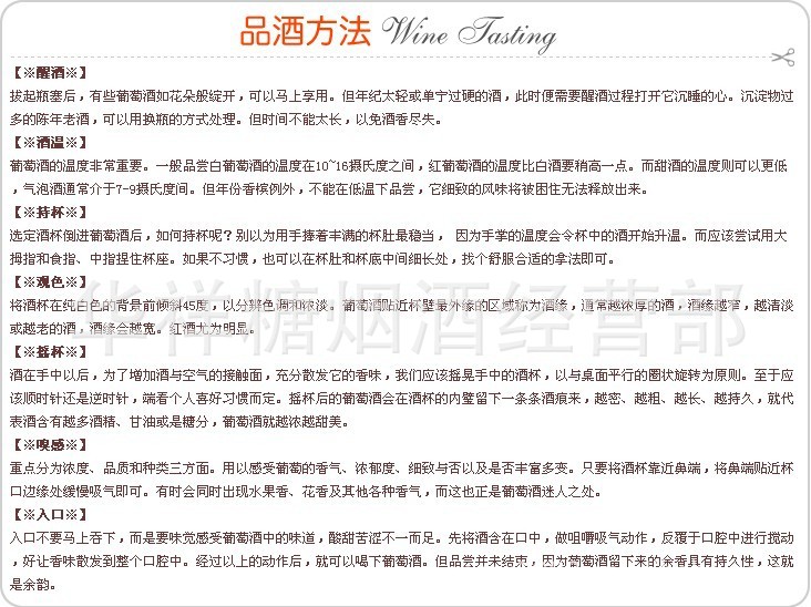 口感:帶有層次豐富多變的新鮮香味,酒體滑溜而強烈,綿長的回味.