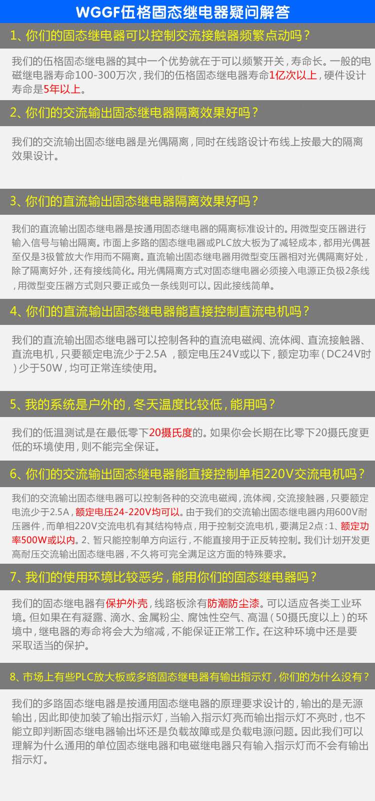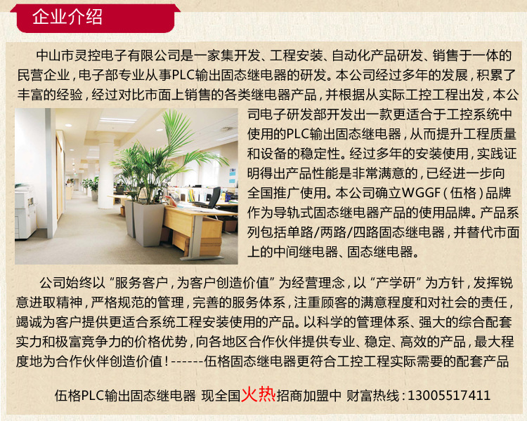 中山市靈控電子有限公司是一家集開發(fā)、工程安裝、自動化產(chǎn)品代理、銷售于一體的民營企業(yè),電子部專業(yè)從事PLC輸出固態(tài)繼電器的研發(fā)。確定WGGF(伍格)品牌作為導(dǎo)軌式固態(tài)繼電器的新產(chǎn)品的使用品牌。包括2路直流固態(tài)繼電器,2路交流固態(tài)繼電器,4路直流固態(tài)繼電器,4路交流固態(tài)繼電器,2路交交固態(tài)繼電器,替代市面上的中間繼電器、固態(tài)繼電器、PLC輸出放大板,PLC功率放大板、可控硅輸出板,晶體管輸出板、繼電器輸出板。
