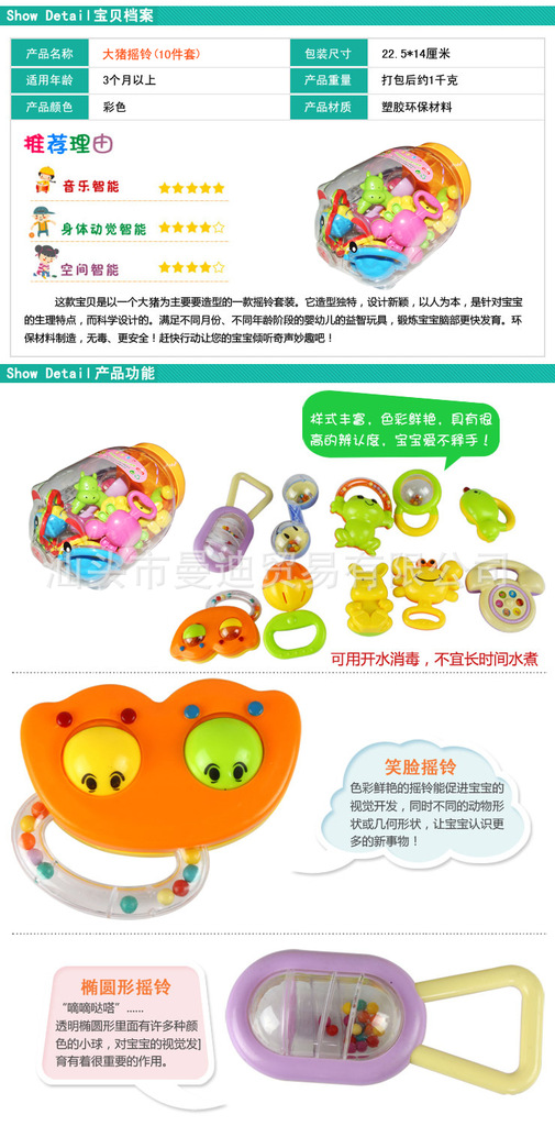 大豬罐裝育兒樂搖鈴(10件套),色彩有溫馨的,有鮮艷的,豐富多彩。共有十種不同的可愛造型,手感不同,樂趣多多。讓寶寶看一看、摸一摸、抓一抓、搖一搖,是訓(xùn)練寶寶初的視覺、聽覺、觸覺的上佳玩具。具體表現(xiàn)在以下幾方面: