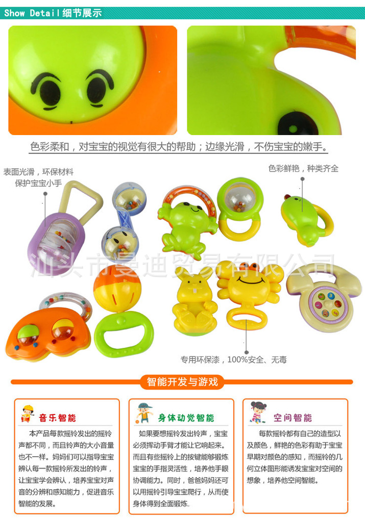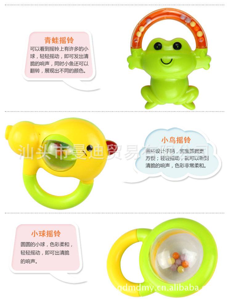 1、感官發(fā)展:各種色彩鮮艷的搖鈴?fù)婢吆颓宕嗟膿u鈴聲,可刺激嬰兒的視覺及聽覺神經(jīng),同時教寶寶認知顏色。