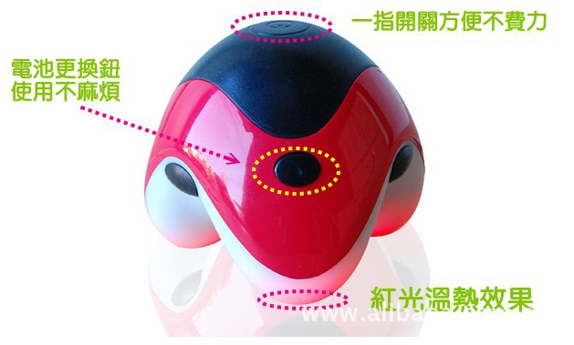 該產(chǎn)品采用3個(gè)獨(dú)立軟觸按[mo]頭,可放松肌肉、舒緩神經(jīng)、促進(jìn)血液循環(huán)、加強(qiáng)細(xì)胞新陳代謝、增強(qiáng)皮膚彈性,可緩解疲勞、明顯減輕各種慢性疼痛、急性疼痛和肌肉酸痛,放松身體減輕壓力,減少皮膚皺紋。使用三節(jié)七號(hào)電池,振動(dòng)時(shí)按[mo]球會(huì)發(fā)出彩色的燈光,攜帶方便,適用全身各個(gè)部位。