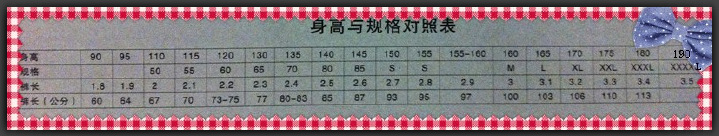 我們訂貨尺碼就以實(shí)際身高為準(zhǔn),孩子多高就報(bào)多高,上面硬性規(guī)定的可選尺碼,您可以作參考,實(shí)際購買時(shí)您可以聯(lián)系我們,具體要哪些尺碼,我們會(huì)按您實(shí)際尺碼給您訂做保證您穿的合身,例如有特殊加肥加大的,您把體重、身高同時(shí)報(bào)出,我們會(huì)量體裁衣,您拍時(shí)就可以隨便挑一個(gè)尺碼,總數(shù)寫在里面,但是我們制作時(shí)會(huì)根據(jù)您和我們談的尺碼制作,這是我們的優(yōu)勢(shì),現(xiàn)在孩子胖的多一些,均碼的衣服他們穿在身上不是大就是小,或胖或瘦。