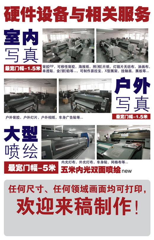 戶外寫真:PP背膠寫真、PP合成紙(不背膠)寫真,燈片寫真、相紙寫真、雙面寫真,隔光布雙面寫真,可轉(zhuǎn)移背膠寫真,專用膜寫真、透明片寫真、PVC膠片寫真、藝術(shù)布寫真、油畫布寫真、白畫布寫真、無仿布寫真,車貼寫真、燈布寫真、單孔透貼寫真