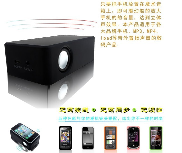 1:魔術(shù)感應(yīng)音箱采用全球互感專利技術(shù),無(wú)需要藍(lán)牙,無(wú)需要接線,只需把手機(jī),如MP3,MP4,MP5,智能帶外音手機(jī)如iphone系列手機(jī)放置在Best揚(yáng)聲器上,即可魔法般地放大內(nèi)置的揚(yáng)聲器聲音。本產(chǎn)品兼容iphone 5、4S、iphone 4、iphone 3G、iphone 3GS、iPod, Touch 4和其它有外置揚(yáng)聲器的手機(jī)。