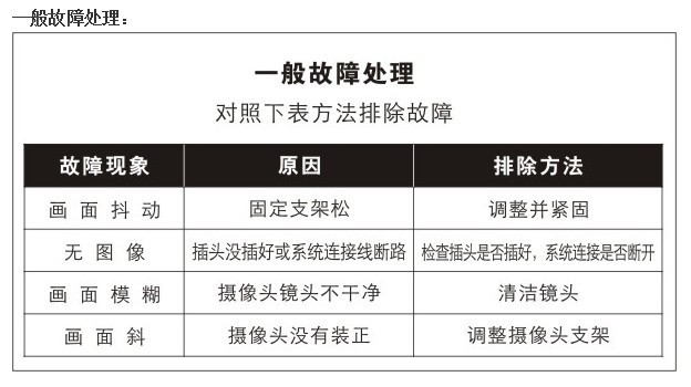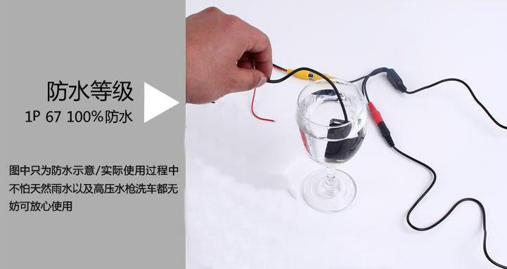 5.5M視頻線 1M電源線電源:DC12V制式:PAL/NTSC2路視頻輸入,倒車優(yōu)先攝像頭防水等級:IP68防水設計,經(jīng)嚴格浸水測試