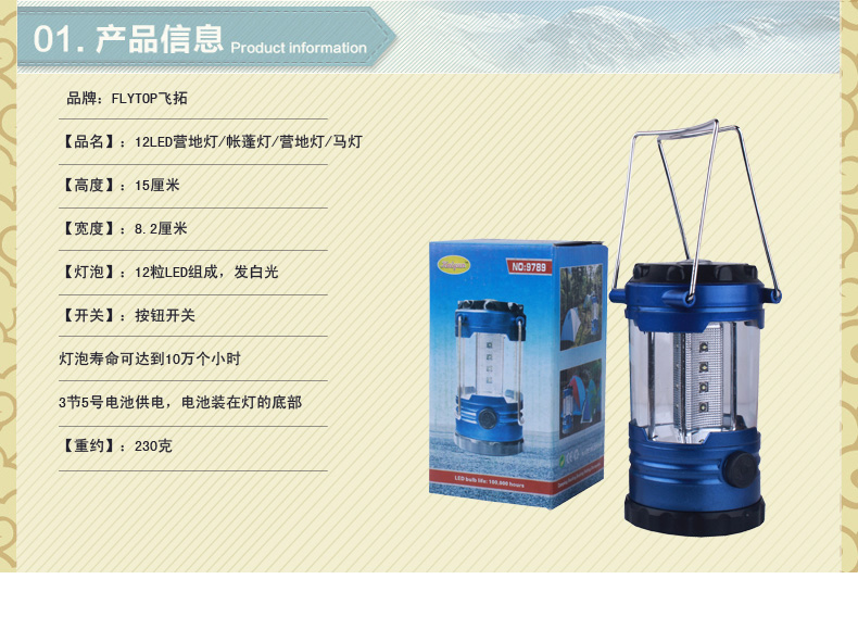 4、野營燈上下端都帶有反光鏡片,能使燈光照得更遠(yuǎn)和更均勻5、3節(jié)5號電池供電,電池裝在燈的底部,打開電池盒蓋(本出售產(chǎn)品不含有電池)些,這種臺燈能照亮40平方米地面