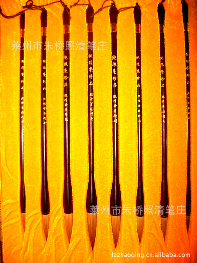 本廠主要生產:狼毫、羊毫、紫毫、兼毫、雞毫、灰鼠毫以及長峰、中峰、短峰、大楷、中楷、小楷,還有特制大提筆、鎮(zhèn)宅筆、高檔珍藏筆、禮品筆共有300多個品種900多個規(guī)格。主要用料筆頭以黑龍江省大興安嶺黃鼠狼尾毛、尾須、獾.針、兔影、貉.子毛、羊毛、羊須。筆桿用湖南湘妃、福建烤.紅等名竹以及虹木、紫譚、像牙、景太蘭等。