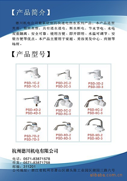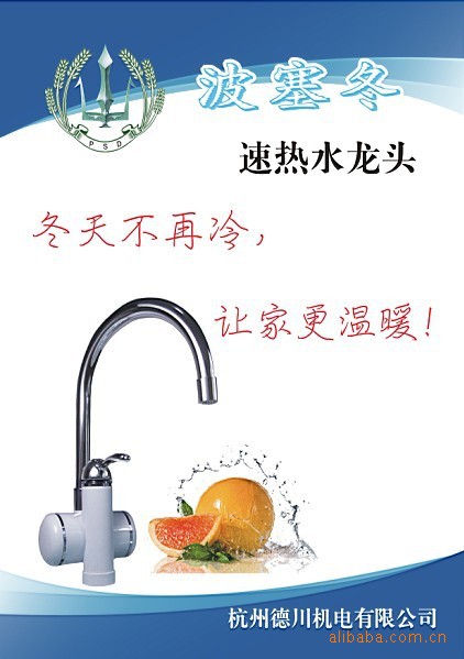杭州德川機(jī)電公司研制的快速電熱水系列產(chǎn)品。本產(chǎn)品造型美觀、精致典雅、具有通水通電、斷水?dāng)嚯?、?jié)水節(jié)電、水電雙重隔離、安全可靠、使用方便、即開即用、水溫可調(diào)節(jié)、安裝方便等優(yōu)點(diǎn)。本產(chǎn)品主要適用于家庭、美容美發(fā)中心、賓館等場所。