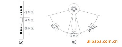 1.如圖(A)或(B)所示,手柄刻度盤分為三個(gè)區(qū)域“冷水區(qū)”、“停止區(qū)”、“熱水區(qū)”使用時(shí)可調(diào)節(jié)到不同的區(qū)域。手柄下旋(在針對(duì)PSD-1C/2C/3D/4D)或右旋(針對(duì)PSD-5C/6C/7D/8D/9D)冷水出水量不斷增大,手柄上旋(針對(duì)PSD-1C/2C/3D/4D)或左旋(針對(duì)PSD-5C/6C/7D/8D/9D)熱水出水量不斷增大,同事熱水水溫將隨出水量增大而降低。打開熱水檔五秒鐘后,水溫逐漸上升并達(dá)到平衡點(diǎn)。