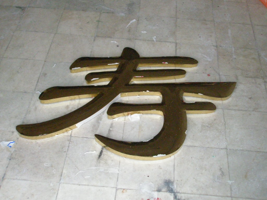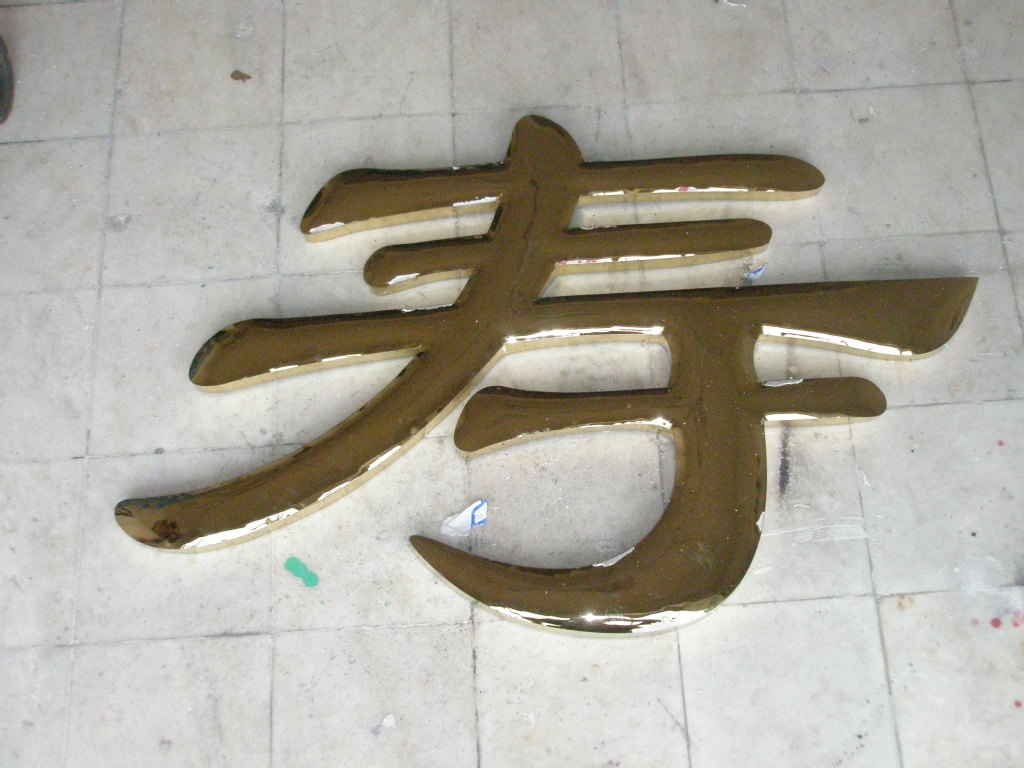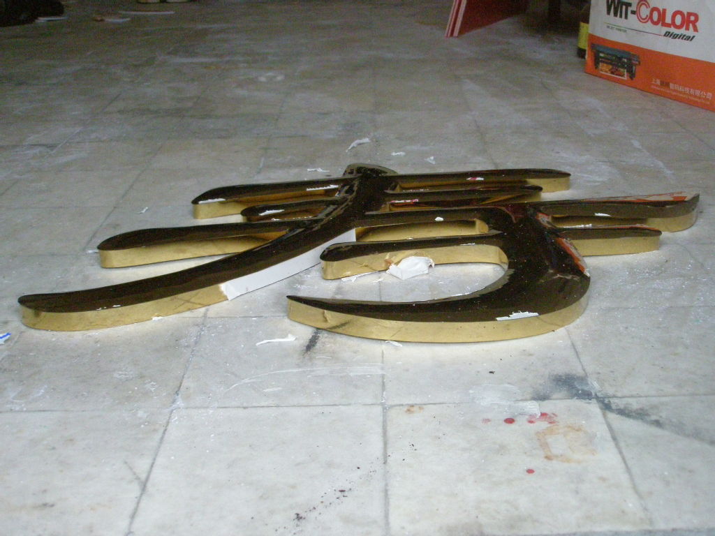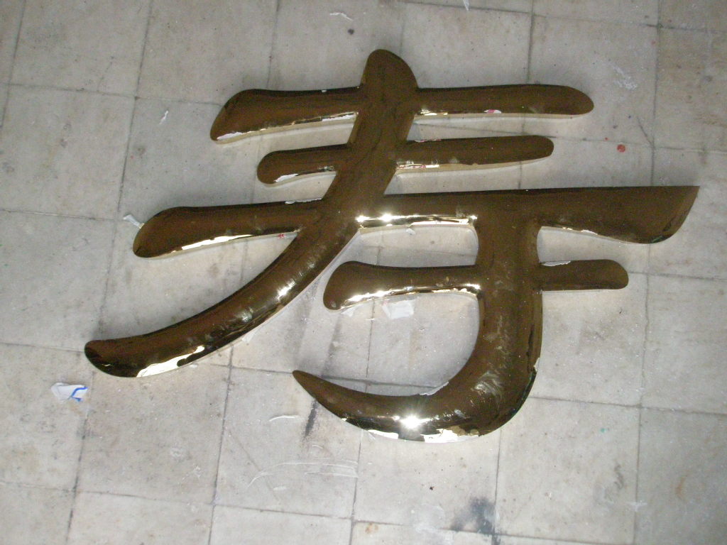 九)鈦金字噴膜:噴膜之前,一定要仔細檢查字表面的光潔度,特別是施工鍍過的字,需要再用布輕拭字面,沒有痕紋或水漬的方可噴膜,用噴槍噴涂,用硝酸纖維漆(無色透明)或過氯乙烯均可。不易過厚。噴好后不要碰,用軟紙包裝,運赴使用現(xiàn)場安裝。