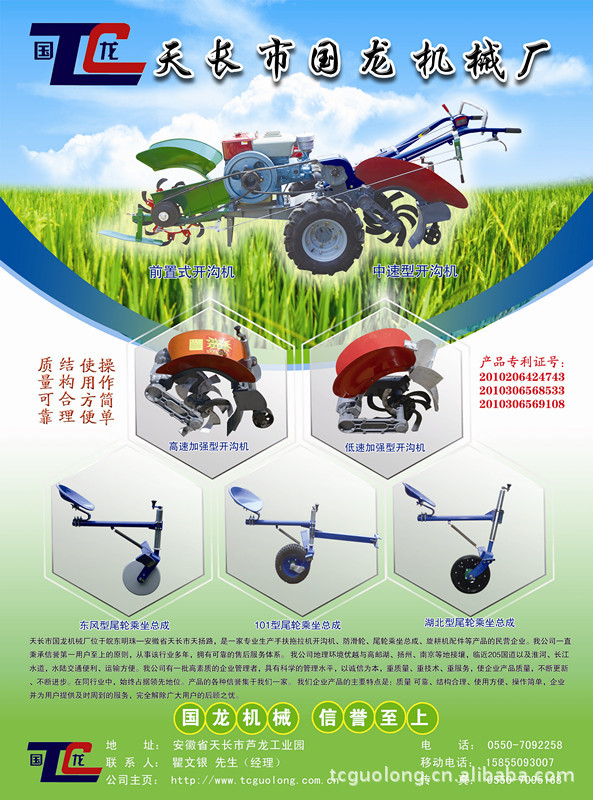 本公司主要經(jīng)營微耕機鋼圈及輪胎400-8鋼圈,全柴180型尾輪總成,東風-12型尾輪總成,工農(nóng)型乘坐總成,武漢型乘坐總成,尾輪叉,腳踏板,防滑輪,1米1.2米蓋耔機,橡膠尾輪,工農(nóng)鑄鐵尾輪,湖北型運輸尾輪,鋼尾輪,101,121,東風-12型前置式開溝機,121,東風-12型后置式開溝機等。本公司秉承“顧客至上,銳意進取”的經(jīng)營理念,堅持“客戶”i安徽省天長市國龍機械廠生產(chǎn)的1GL-12型前置式開溝機,適用于三麥、油菜等農(nóng)田開溝作業(yè)。