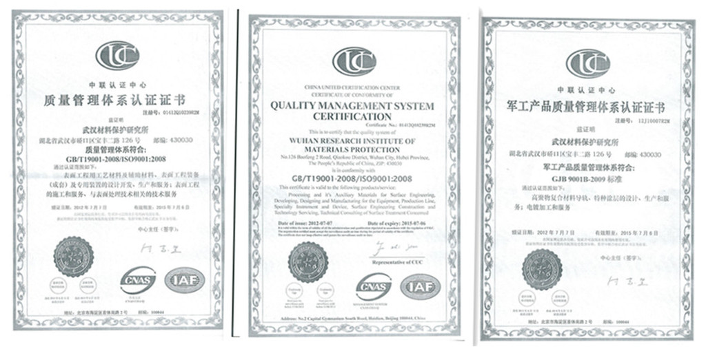 武漢材料保護(hù)研究所始建于1953年,原為機械工業(yè)部直屬大型骨干研究所,隨著我國科技體制改革的發(fā)展,轉(zhuǎn)制為科技型企業(yè),現(xiàn)隸屬于國務(wù)院國有資產(chǎn)管理委員會管理的機械科學(xué)研究總院。經(jīng)過50余年的發(fā)展,武漢材料保護(hù)研究所已成為表面處理工藝、材料、設(shè)備的研發(fā)與生產(chǎn),表面覆蓋層性能測試、產(chǎn)品質(zhì)量檢測,表面保護(hù)工程設(shè)計與施工的高新技術(shù)企業(yè),并通過GB/T19001-2008/ISO9001:2008質(zhì)量管理體系認(rèn)證,GJB9001B-2009軍工產(chǎn)品質(zhì)量管理體系認(rèn)證。