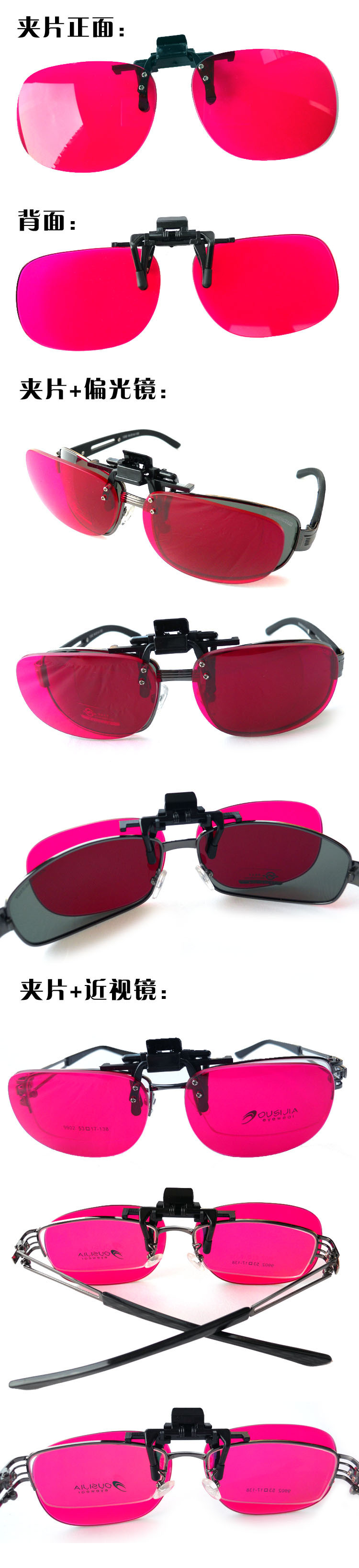 此夾片專門針對(duì)色盲色弱設(shè)計(jì),佩戴使用方法同普通的偏光夾片一樣。摘戴非常方便,不需要用的時(shí)候可自行隨時(shí)摘下便可,也可很好保護(hù)消費(fèi)者隱私。尤其適合于有近視、遠(yuǎn)視、散光等因特殊難度不宜定制的框架鏡片,但又需要配戴的朋友。