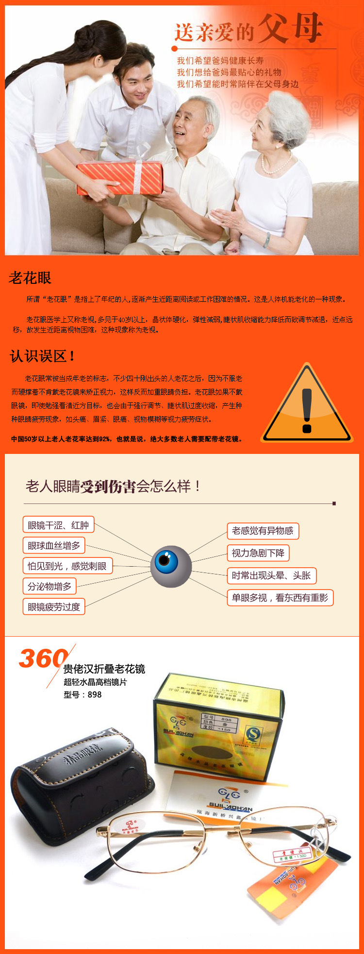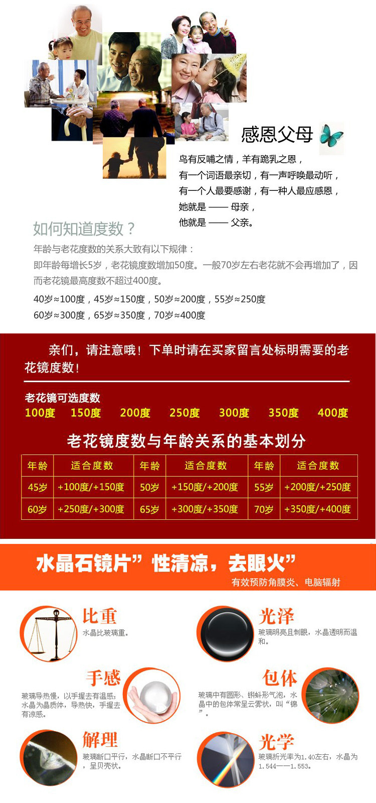 貴佬漢系列老花鏡采用了水晶材質(zhì),按照國家GB13511-1999執(zhí)行標(biāo)準(zhǔn)裝配成鏡,使中老年朋友