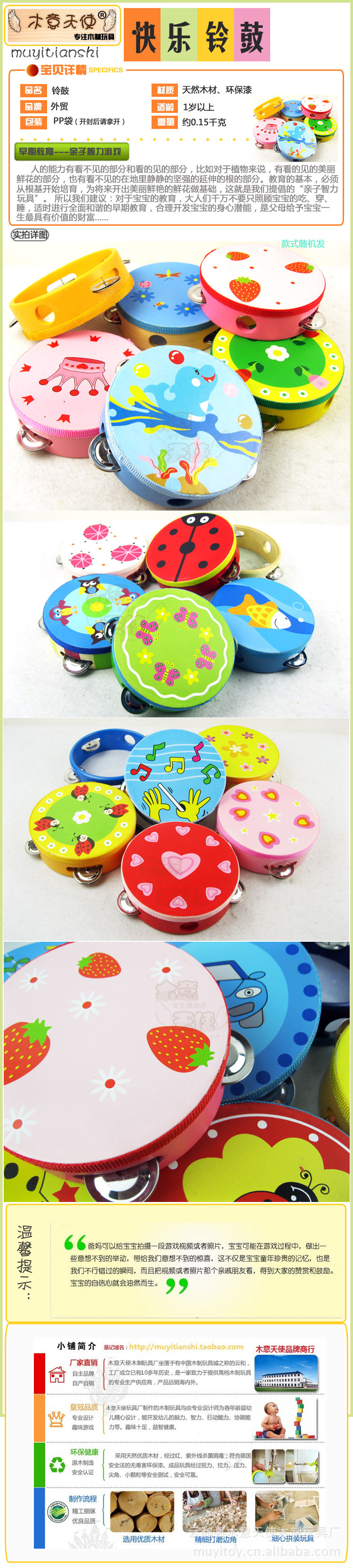 產(chǎn)品介紹:本款產(chǎn)品采用天然荷木環(huán)保漆精心制作而成,鼓面上絲印上可愛的動物圖案,圓形的手柄上有四個(gè)鈴;寶寶們喜歡有聲音的物體,敲擊對寶寶肢體運(yùn)動感覺很有幫助,同時(shí)也可以訓(xùn)練手眼協(xié)調(diào)能力??蓯蹌e致的動物手搖鈴鼓樂聲清脆,音色飽滿;讓孩子在敲擊的過程中開發(fā)孩子潛在的藝術(shù)細(xì)胞,增添樂感,從而達(dá)到學(xué)習(xí)音樂常識的目的.
