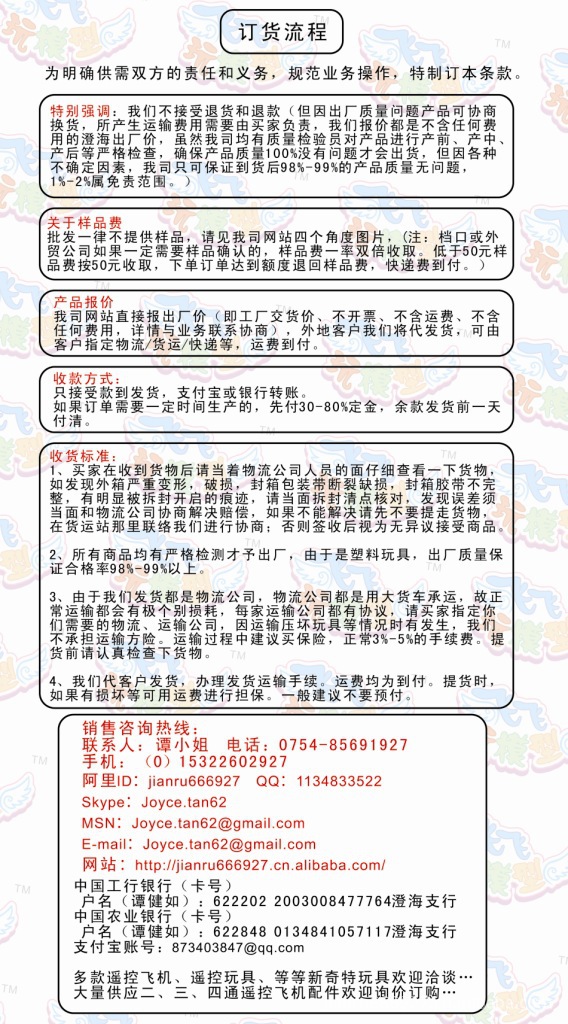 飛飛玩模型位于汕頭市澄海區(qū),地理位置優(yōu)越,交通便利。主要銷(xiāo)售各種遙控玩具和電動(dòng)玩具以及其它功能的塑膠玩具、工藝品、電子配件等。擁有一批專(zhuān)業(yè)的內(nèi)銷(xiāo)和外貿(mào)的專(zhuān)業(yè)營(yíng)銷(xiāo)人才,以“客戶(hù)的需要”為工作導(dǎo)向及時(shí)高效的滿(mǎn)足客戶(hù)需求??蛻?hù)遍布全球多個(gè)國(guó)家和地區(qū),形成強(qiáng)大的營(yíng)銷(xiāo)網(wǎng)絡(luò)、良好的服務(wù)體系和穩(wěn)固的經(jīng)貿(mào)關(guān)系。