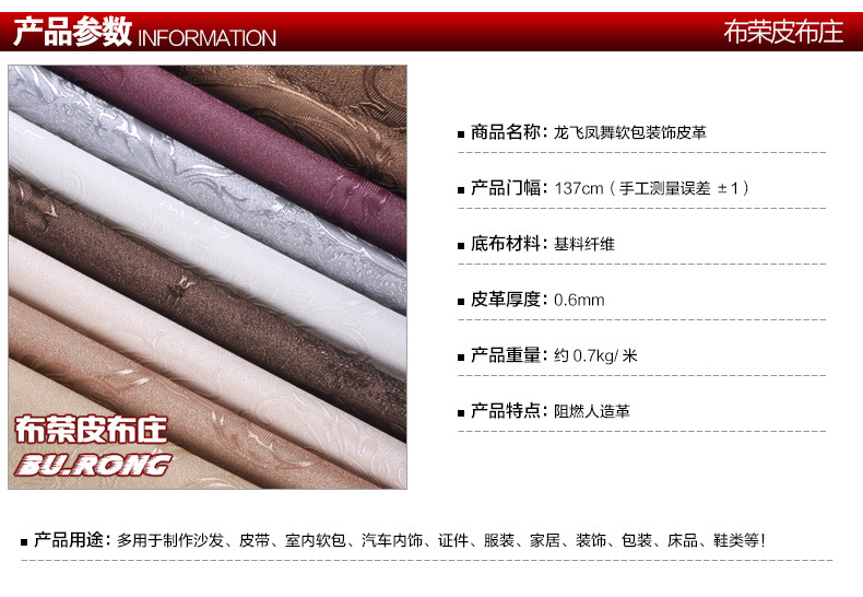 麒翔皮革成立于1999年,公司總部設(shè)立在浙江省義烏市,公司擁有完整科學(xué)的質(zhì)量管理體系。網(wǎng)店布榮貿(mào)易有限公司誠信經(jīng)營、服務(wù)周到、在業(yè)界得到廣泛的認可。十幾年來本公司專注生產(chǎn)經(jīng)營各種PU、PVC、壓花人造革,適用于皮帶、箱包、服裝、證件、商標(biāo)、球類、沙發(fā)、玩具、鞋、工藝品及裝飾?;y領(lǐng)先獨特、種類繁多、并配合客戶的產(chǎn)前開發(fā)!常規(guī)貨都有大量現(xiàn)貨批發(fā)!