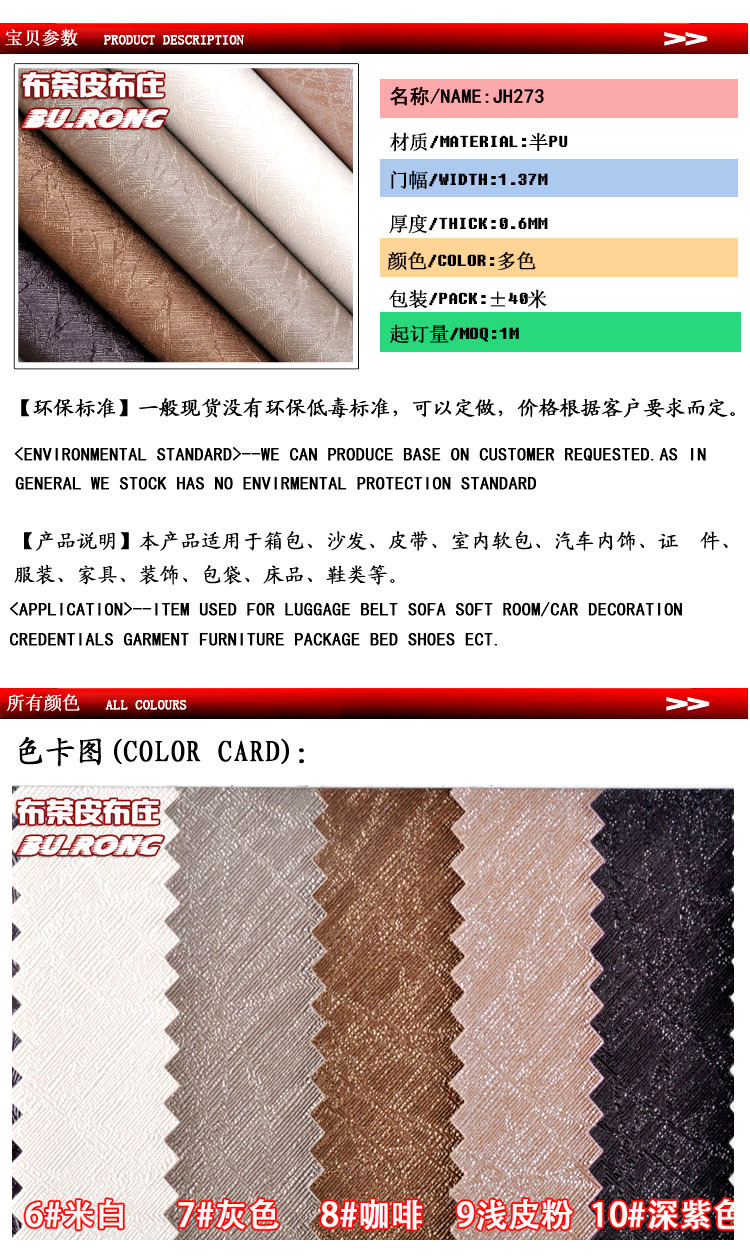 麒翔皮革成立于1999年,公司總部設(shè)立在浙江省義烏市,公司擁有完整科學(xué)的質(zhì)量管理體系。網(wǎng)店布榮貿(mào)易有限公司誠信經(jīng)營、服務(wù)周到、在業(yè)界得到廣泛的認(rèn)可。十幾年來本公司專注生產(chǎn)經(jīng)營各種PU、PVC、壓花人造革,適用于皮帶、箱包、服裝、證件、商標(biāo)、球類、沙發(fā)、玩具、鞋、工藝品及裝飾?;y領(lǐng)先獨(dú)特、種類繁多、并配合客戶的產(chǎn)前開發(fā)!常規(guī)貨都有大量現(xiàn)貨批發(fā)!