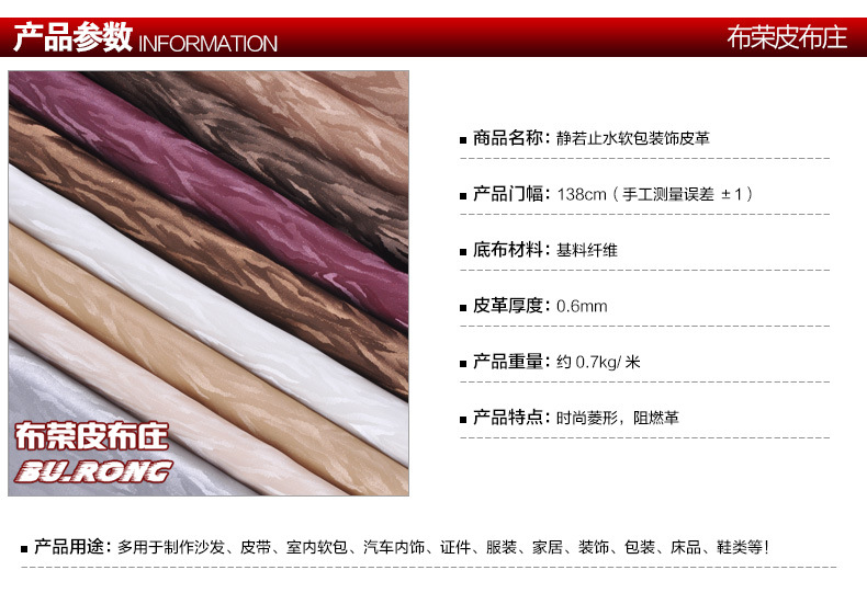 麒翔皮革成立于1999年,公司總部設(shè)立在浙江省義烏市,公司擁有完整科學(xué)的質(zhì)量管理體系。網(wǎng)店布榮貿(mào)易有限公司誠(chéng)信經(jīng)營(yíng)、服務(wù)周到、在業(yè)界得到廣泛的認(rèn)可。十幾年來(lái)本公司專注生產(chǎn)經(jīng)營(yíng)各種PU、PVC、壓花人造革,適用于皮帶、箱包、服裝、證件、商標(biāo)、球類、沙發(fā)、玩具、鞋、工藝品及裝飾?;y領(lǐng)先獨(dú)特、種類繁多、并配合客戶的產(chǎn)前開(kāi)發(fā)!常規(guī)貨都有大量現(xiàn)貨批發(fā)!