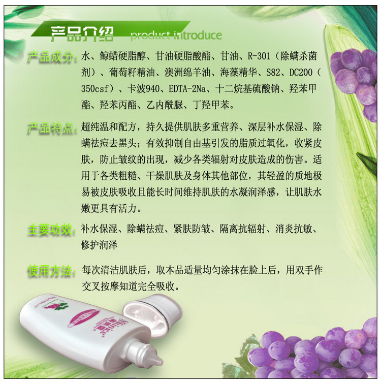 產(chǎn)品特點:超純溫和配方、持久提供肌膚多重營養(yǎng)、深層補(bǔ)水保濕、除螨祛痘去黑頭;有效抑制自由基引發(fā)的脂質(zhì)過氧化,收緊肌膚,防止皺紋的出現(xiàn),減少各類輻射對皮膚造成的傷害。適用于各類粗糙、干燥肌膚和身體其他部位,其輕盈的質(zhì)地極易被肌膚吸收、長時間保持肌膚的水凝潤澤感,讓肌膚水嫩更具活力。