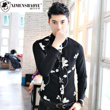 2013男式秋季韓版修身時尚潮男式襯衫 個性繡花雪紡黑色男士襯衣