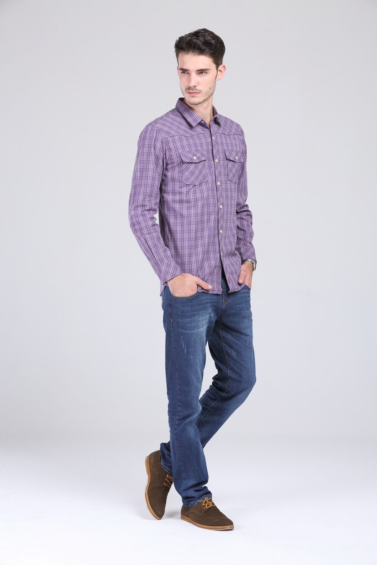 全棉男式色織格子休閑雙胸袋水洗襯衫