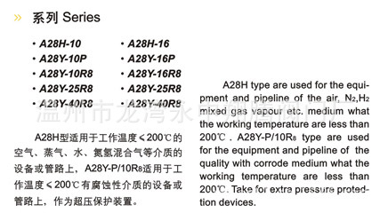 A28H適用于工作溫度≤200℃的空氣、蒸汽、水、氮?dú)浠旌蠚獾冉橘|(zhì)的設(shè)備或管路上,作為超壓保護(hù)裝置。