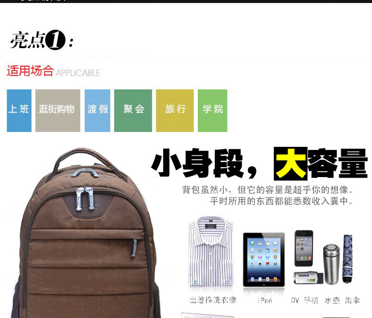 【包包特點】舒適的流水曲線型肩帶,能有效的起到防滑落的作用。厚軟的海綿結(jié)構(gòu)能有效的緩沖外力對肩部,腰部,尾椎部的壓迫,無論您是出差,旅行,還是日常背帶電腦或其他物件,都能很好的保護您的身體及物件不受損傷。肩帶與包身的寬面積自然縫合,完全解決的普通背包肩帶縫合處易于開裂的弊端。