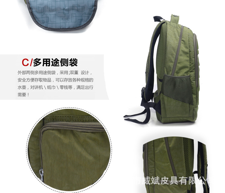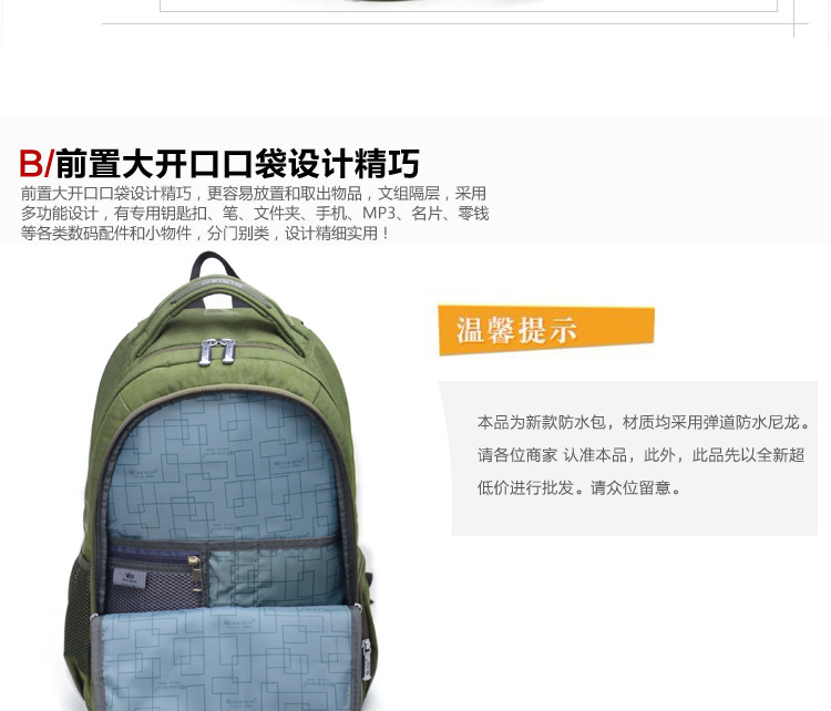 采用尼龍面料,具有防水功能,極其富有質(zhì)感,做工精致,每一個細(xì)節(jié)都體現(xiàn)了威斌的不凡魅力。豪華精致的做工與設(shè)計搭配富有品位的您,適合任何場合。威斌箱包極盡奢華之設(shè)計,顯示您尊榮華貴的象征,體現(xiàn)與眾不同的氣質(zhì)!讓您脫穎而出,備受注目!此包包人性化,多功能設(shè)計,讓您帶著輕松愉快的心情工作休閑!