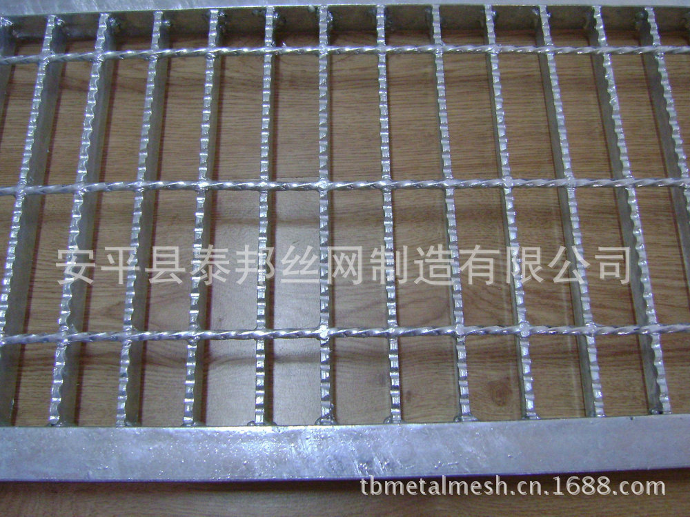壓鎖鋼格板:有一定尺寸的普碳扁鋼、不銹鋼、鋁板經(jīng)開槽(孔)、插接壓鎖、焊接、精整等工序制造而成。在承載扁鋼和橫桿的每個交叉點處,通過壓力將橫桿壓入承載扁鋼或預(yù)先開好槽的承載扁鋼中,將其固定的鋼格板叫做壓鎖鋼格板。壓鎖鋼格板的橫桿也采用扁鋼。