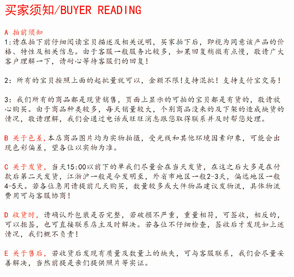 溫馨提醒:本店默認(rèn)快遞是天天快遞,所以運(yùn)費(fèi)模版是按天天快遞的運(yùn)費(fèi)來設(shè)置的,如果您所在的地區(qū)天天快遞不到的,要發(fā)其他快遞,我們只能按照它們官方價(jià)格發(fā)貨,如果等您拍完付款后再叮囑我們發(fā)其他快遞,我們只能發(fā)天天快遞,或者退款給您,請(qǐng)見諒!