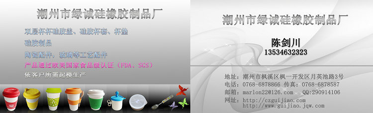 公司專業(yè)生產陶瓷杯硅膠蓋,硅膠杯套,陶瓷杯硅膠蓋,硅膠杯蓋,保鮮碗蓋,雙層陶瓷杯硅膠杯套,硅膠、橡膠雜件,硅膠陶瓷配件,不銹鋼配件,汽車配件,各種密封圈,防水圈,O型圈,杯碗蓋,酒瓶密封圈,酒瓶塞,味具塞,手環(huán),表帶,防滑防熱墊等,產品廣泛用于陶瓷、五金配件、電腦玩具、運動器材及家居用品等行業(yè),產品均通過歐美國家食品級認證(FDA、SGS)。