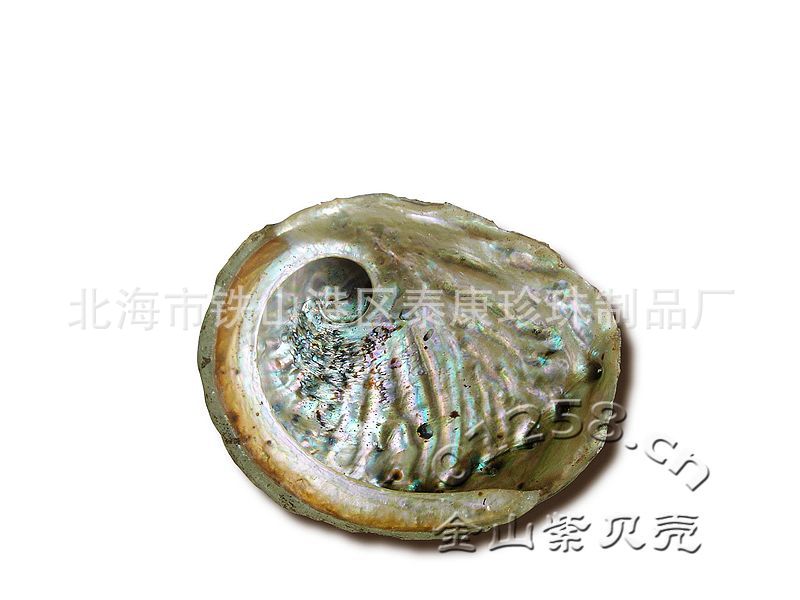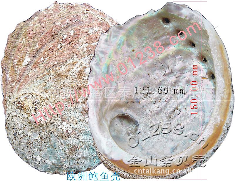 雜色鮑:呈長卵圓形,內(nèi)面觀略呈耳形,長7~9cm,寬5~6cm,高約2cm。表面暗紅色,有多數(shù)不規(guī)則的螺肋和細密生長線,螺旋部小,體螺部大,從螺旋部頂處開始向右排列有20余個疣狀突起,末端6~9個開孔,孔口與殼面平。內(nèi)面光滑,具珍珠樣彩色光澤。殼較厚,質(zhì)堅硬,不易破碎。無臭,味微咸。