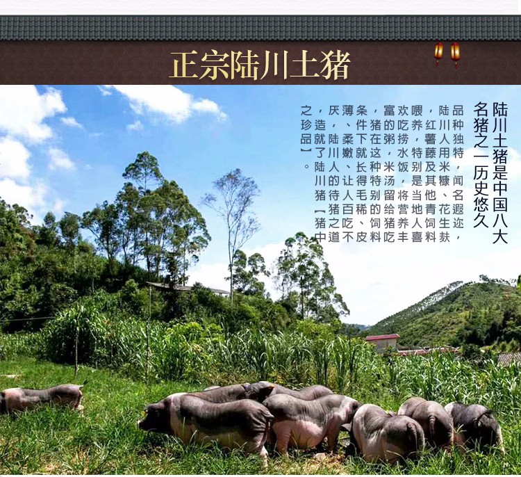 陸川豬是中國(guó)八大名豬之一,歷史悠久,品種優(yōu)良,聞名遐邇,陸川人用米糠、花生麩、紅薯藤及其它青飼料喂養(yǎng),特別是當(dāng)?shù)厝讼矏?ài)吃撈水飯,將營(yíng)養(yǎng)豐富的粥、米湯留給豬吃,豬在這種特別的飼養(yǎng)條件下就長(zhǎng)得毛稀、皮薄、肉嫩、讓人百吃不厭,陸川人的待豬之道造就了陸川豬【豬中之珍品】。