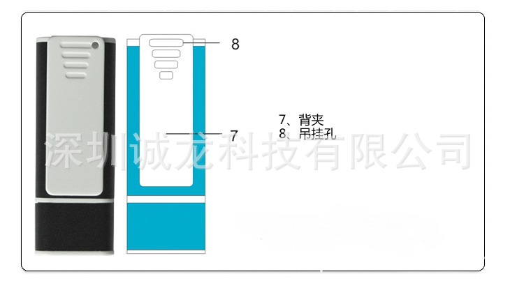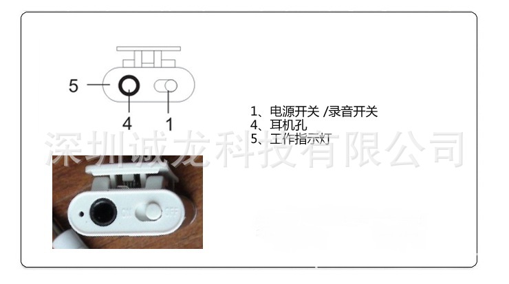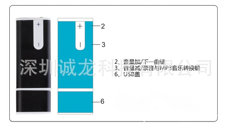 3、具體功能操控也比較簡單:錄音狀態(tài)下無需任何操作;音樂播放狀態(tài)下,短按“ ”為“上一曲”,長按為音量加;短按“-”為錄音文件與MP3文件切換,長按為音量減。