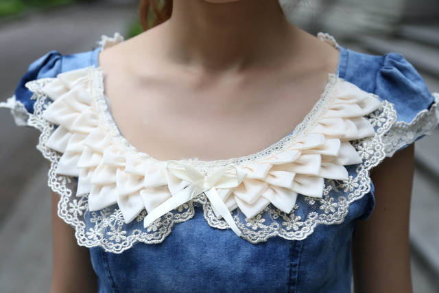 這款衣服,胸前領(lǐng)上層層雪紡加花邊的處理,做工精致,無(wú)可挑剔