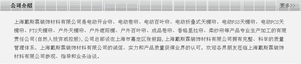 上海戴斯霖裝飾材料有限公司是一家開發(fā)銷售電動窗飾·智能遮陽產(chǎn)品的專業(yè)公司。主要產(chǎn)品有:電動開合簾、電動卷簾、電動百葉簾、電動折疊式天棚簾、電動FSS天棚簾、電動FCS天棚簾、FTS天棚簾、戶外天棚簾、戶外遮陽棚、戶外百葉簾、成品卷簾、香格里拉簾、柔紗簾等產(chǎn)品,專業(yè)生產(chǎn)加工的有限責任公司(自然人投資或控股),公司總部設(shè)在上海市嘉定區(qū),公司擁有完整、科學的質(zhì)量管理體系。公司的誠信、實力和產(chǎn)品質(zhì)量獲得業(yè)界的認可。歡迎各界朋友蒞臨參觀、指導和業(yè)務洽談。