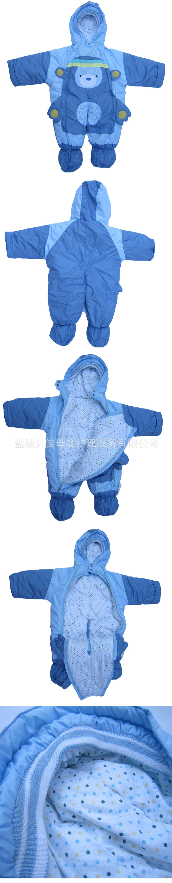 外面是柔軟的就像我們羽絨服的外面的料子一樣,(寶寶如果在穿著過程中弄臟了一點點媽媽們可以用濕布擦一擦,不是很臟的話不用總是洗哦!很方便的!)顏色鮮亮活潑,有藍色小熊和枚紅色小熊兩種,里料是純棉布,夾層是柔軟的保暖絲綿,整個抱服柔軟厚實,寶寶穿上就像蓋著一個軟軟的厚被子!帽子口部有松緊,媽媽們不用擔(dān)心寶寶頭部灌風(fēng)了!