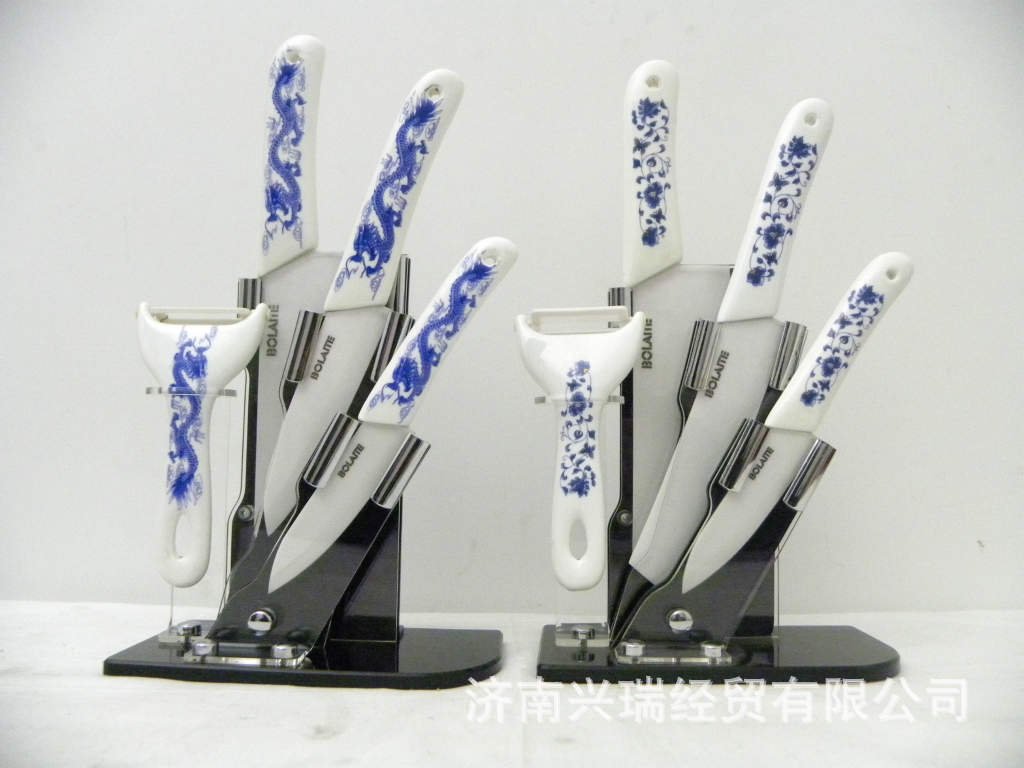 規(guī)格:菜刀6寸,廚師刀6寸、水果刀4寸、青龍印花瓷削皮器;亞克力刀架;精品禮盒包裝。