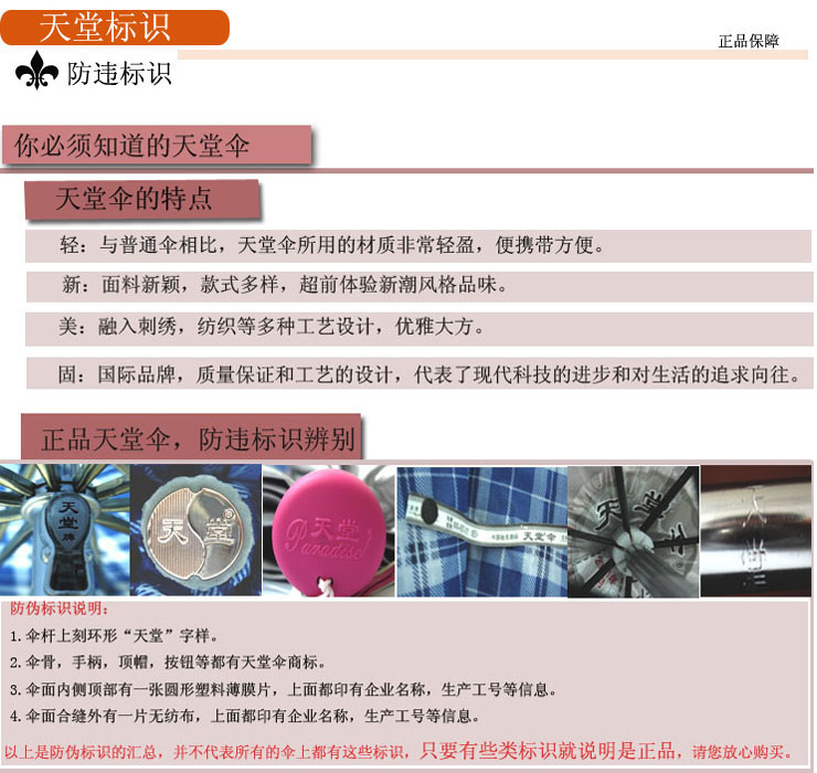 尊敬的客戶 本公司為天堂傘深圳代理商 實力厚雄 本店購買天堂傘 假一罰百 質(zhì)量問題、終身免費保修 十年批發(fā) 品種全、品質(zhì)優(yōu)、價格堅持,歡迎廣大新老客戶零買,團(tuán)購,批發(fā)。另本公司常年承接印刷廣告?zhèn)阌唵?。售前咨詢電話:王小? 售后電話: 林生 小飛 我們的追求,讓每個用戶花少的錢,買到優(yōu)的產(chǎn)品,貼心的服務(wù)