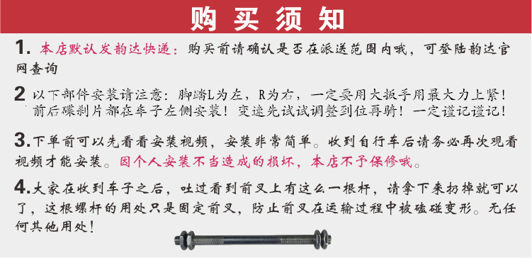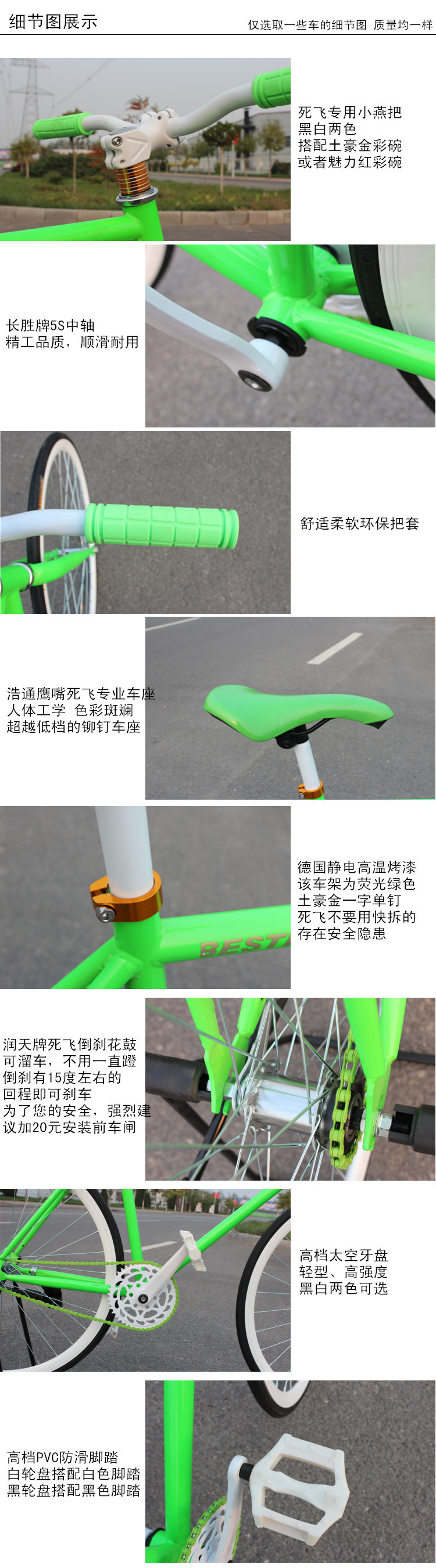 安裝說(shuō)明:整車(chē)90%安裝完畢,超簡(jiǎn)單安裝:只需要安裝前輪,車(chē)座,車(chē)把即可。所以,親們,再不用為裝車(chē)為難了,(一般網(wǎng)上銷(xiāo)售的車(chē)子很多為散件,裝起來(lái)比較麻煩)此死飛倒騎15度回程則剎車(chē),騎友們都叫它倒剎車(chē),車(chē)頭可360度旋轉(zhuǎn),可抬車(chē)頭,倒剎漂移等多種基本動(dòng)作,它可以滿足日常生活中的代步,休閑,逛街,郊游!公路車(chē)能做的它都可以。