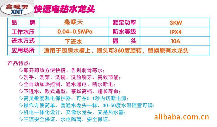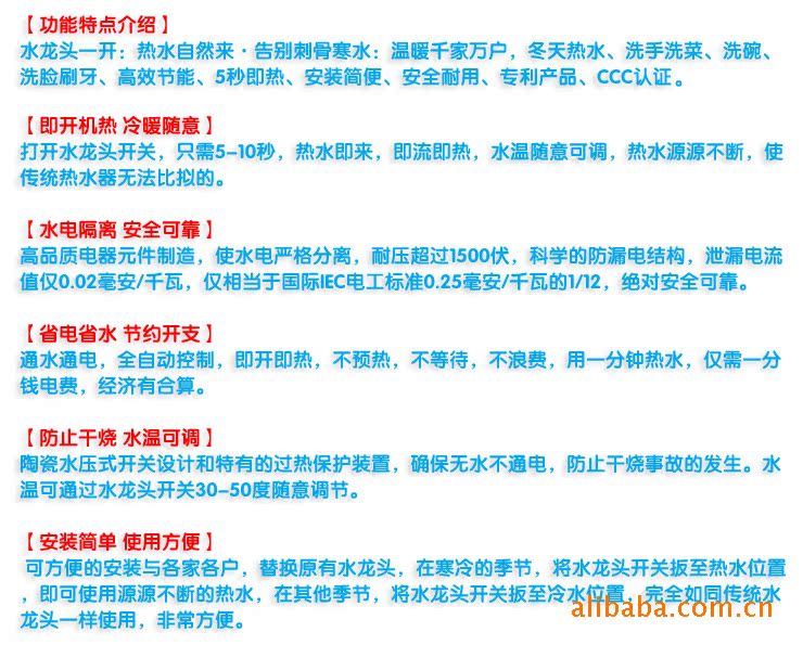 五、鑫暖天電熱水龍頭優(yōu)點(diǎn)是:省水,省電,省空間,使用方便,高效,一年365天不管什么時候想用熱水就有熱水,溫度30-60度可無極調(diào)溫(與水量成反比),冷熱水雙用,一個水龍頭當(dāng)二個用,無需預(yù)熱,無需保溫,即開即熱。