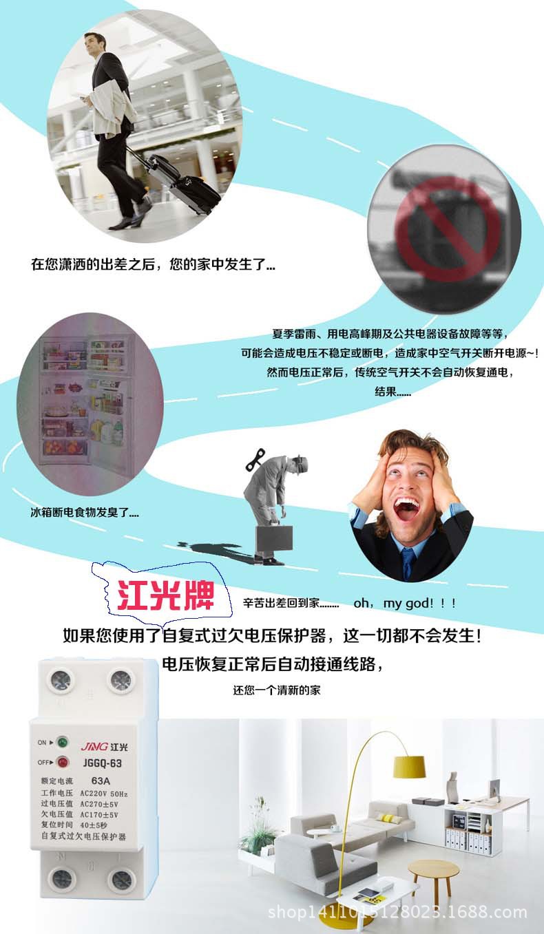 JGGQ-63自復(fù)式過欠電壓保護(hù)器采用控制線路采用高速微低功耗處理器為核心、磁保持繼電器為主電路、模數(shù)化標(biāo)準(zhǔn)設(shè)計(jì),當(dāng)供電線路出現(xiàn)過電壓、欠電壓時,保護(hù)器能在持續(xù)高壓沖擊下迅速、安全地切斷電路,避免異常電壓送入終端電器造成事故的發(fā)生,當(dāng)電壓恢復(fù)正常值,保護(hù)器將在規(guī)定時間內(nèi)自動接通電路,確保終端電器在無人值守情況下正常運(yùn)行。