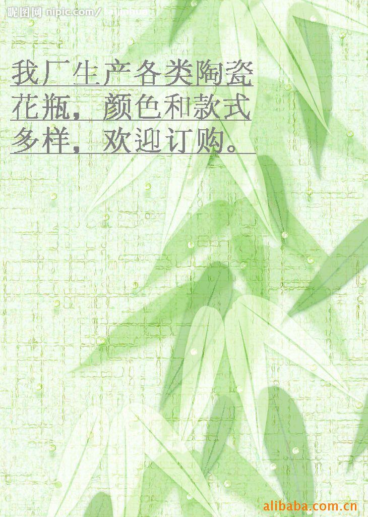 我司/廠位于有“中國陶瓷之都”之稱的廣東省潮州市,是一家專業(yè)生產(chǎn)各類工藝和日用陶瓷的廠家。產(chǎn)品有出口外銷到世界各地,也有內(nèi)銷于國內(nèi)城市。