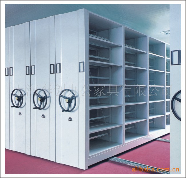 密集架主要由軌道、底盤、立柱、上蓋、擱板、掛板、檔梁、側(cè)板、面門、傳動機構(gòu)和密封裝置等部件組成。