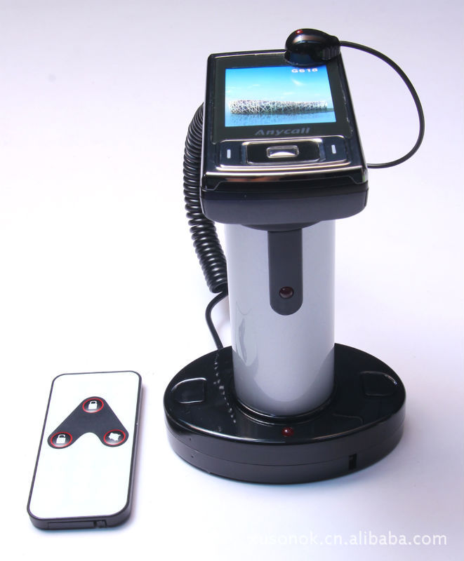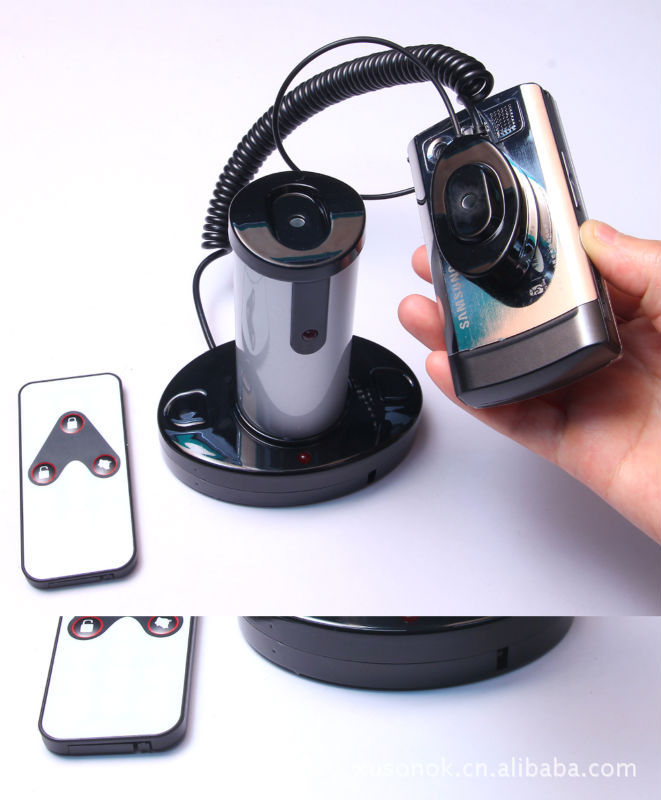 手機、數(shù)碼相機、MP3、MP4、GPS等數(shù)碼電子產(chǎn)品實際陳列于本品上,本產(chǎn)品由報警主機、報警探頭、展示支架等組成。報警主機安裝于展示架或陳列柜上,報警探頭則粘附于展示產(chǎn)品上。顧客可以方便的從架子上取下陳列品,自由的對陳列品的功能和外觀進(jìn)行操作和試用,如果顧客想將陳列品拿走,報警器會立即發(fā)出持續(xù)的報警聲,報警聲將持續(xù)到管理人員來做復(fù)位處理為止。