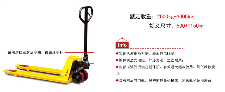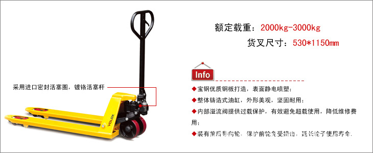 產(chǎn)品詳細參數(shù)貨 號額定載重貨叉高度貨叉高度單個貨叉寬度貨叉整體寬度貨叉長度前輪規(guī)格后輪規(guī)格凈重單位kgmmmmmmmmmmmmmmkg10v00393200085205160530115080*60200*507510v00394200085205160685122080*60200*507810v00395250085205160540115080*70200*507710v00396250085205160680122080*70200*508010v00397300085205160540115080*70200*508510v00398300085205160680122080*70200*5088快速訂購、支持專線:400-8866-890